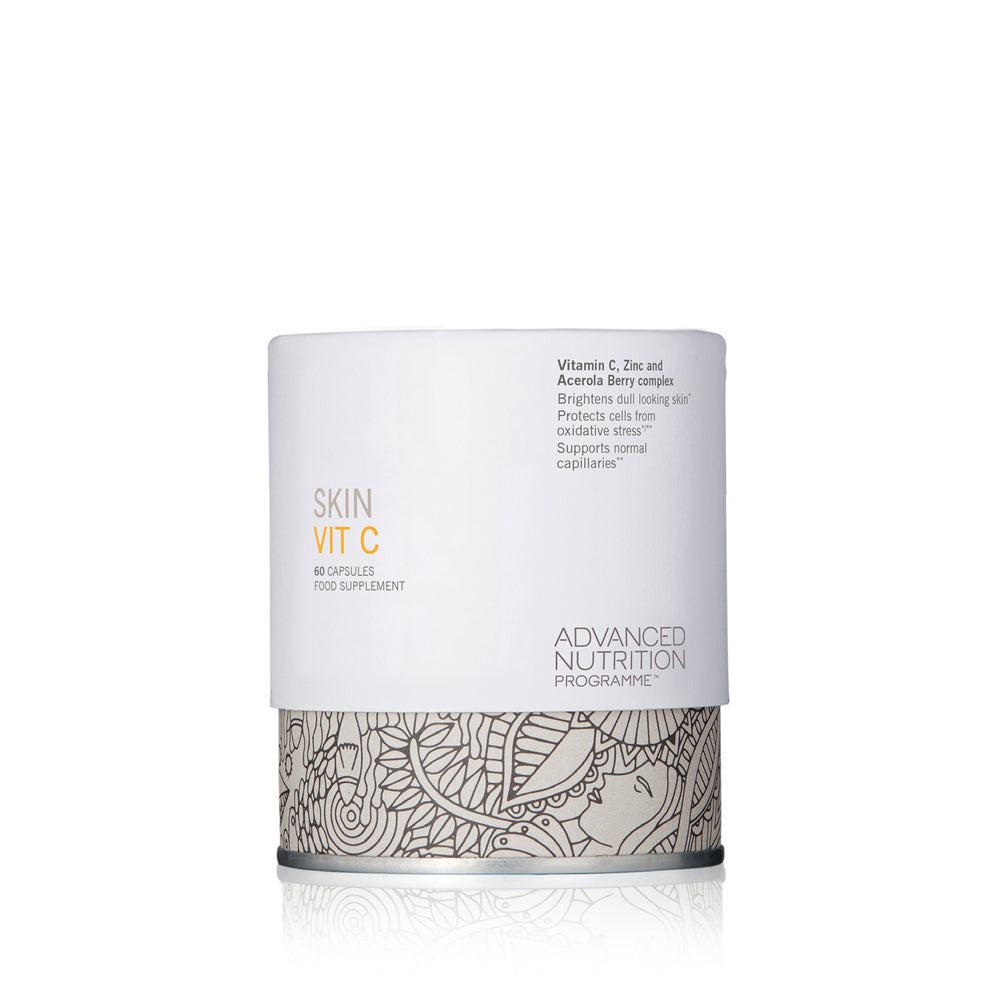 Skin Vit C is our updated vitamin C supplement powered by three key ingredients: vitamin C, zinc and acerola berry in a daily dose vitamin capsule to help brighten dull-looking skin. All three ingredients are protected in a clean, plant-based capsule and suitable for vegan and vegetarian lifestyles.