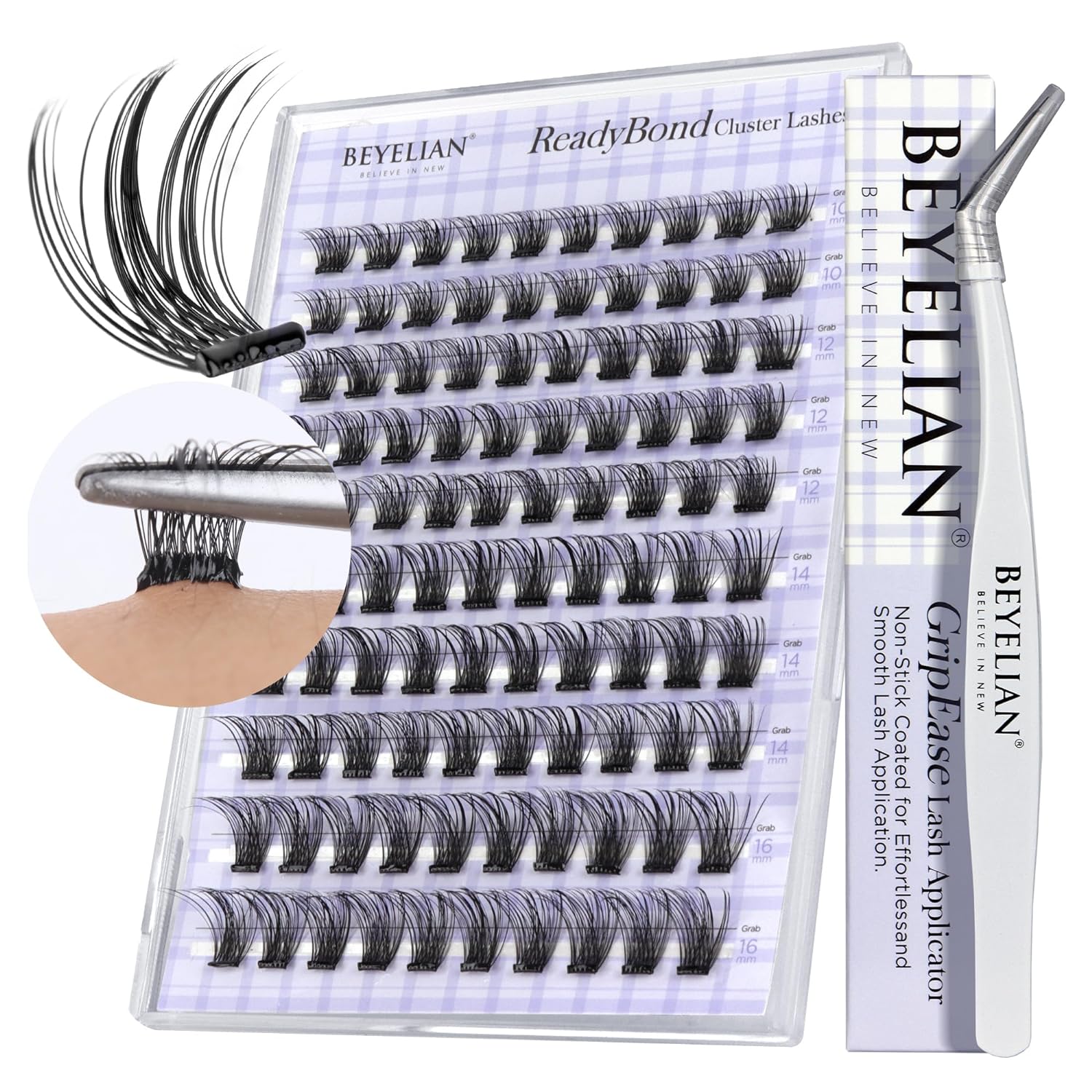 BEYELIAN Self Adhesive Eyelashes Lash Clusters D+ Curl 10-16mm 100 Pcs with Lash Tweezers DIY Lash Kit No Glue Eyelashes Self Stick Lashes No Damage Reusable Lashes Self Adhesive No Sticky (R03)