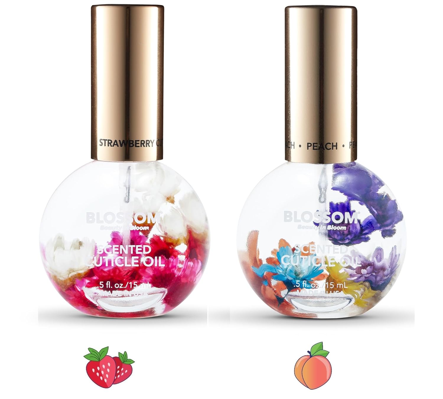 Blossom Hydrating, Moisturizing, Strengthening, Scented Cuticle Oil, Infused with Real Flowers, Made in USA, 2 Pack Bundle, Juicy Peach/Strawberry
