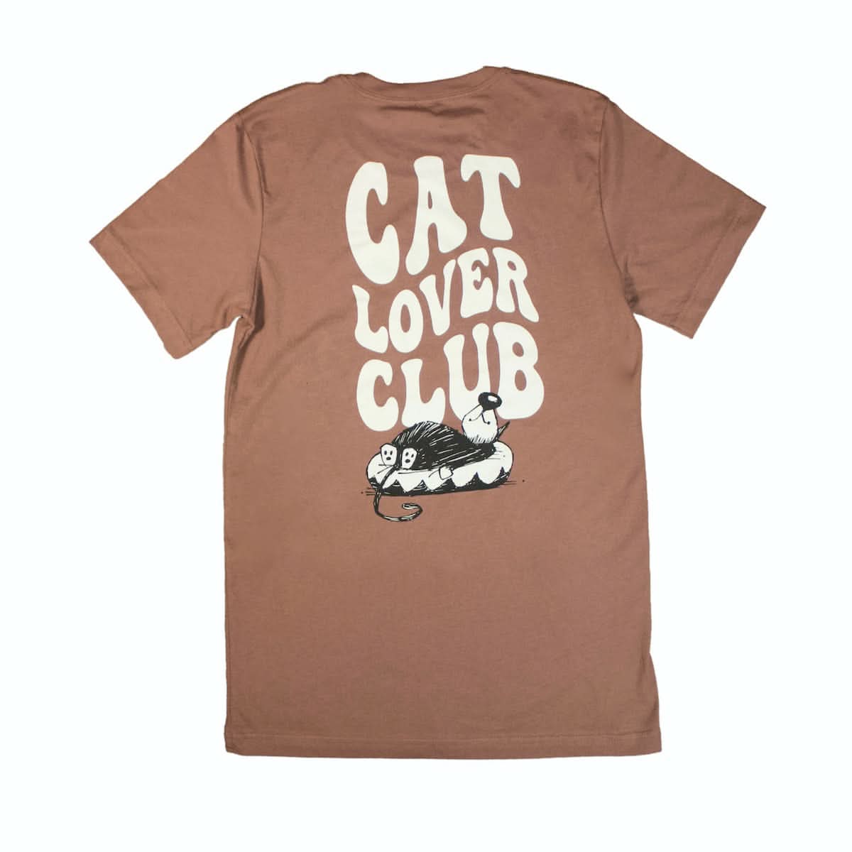 Declare your loyalties with our new tee for cat lovers! This soft chestnut brown tee features an image of a napping Mooch alongside the phrase "Cat Lover Club" on the back of it and has an understated, image-free front.