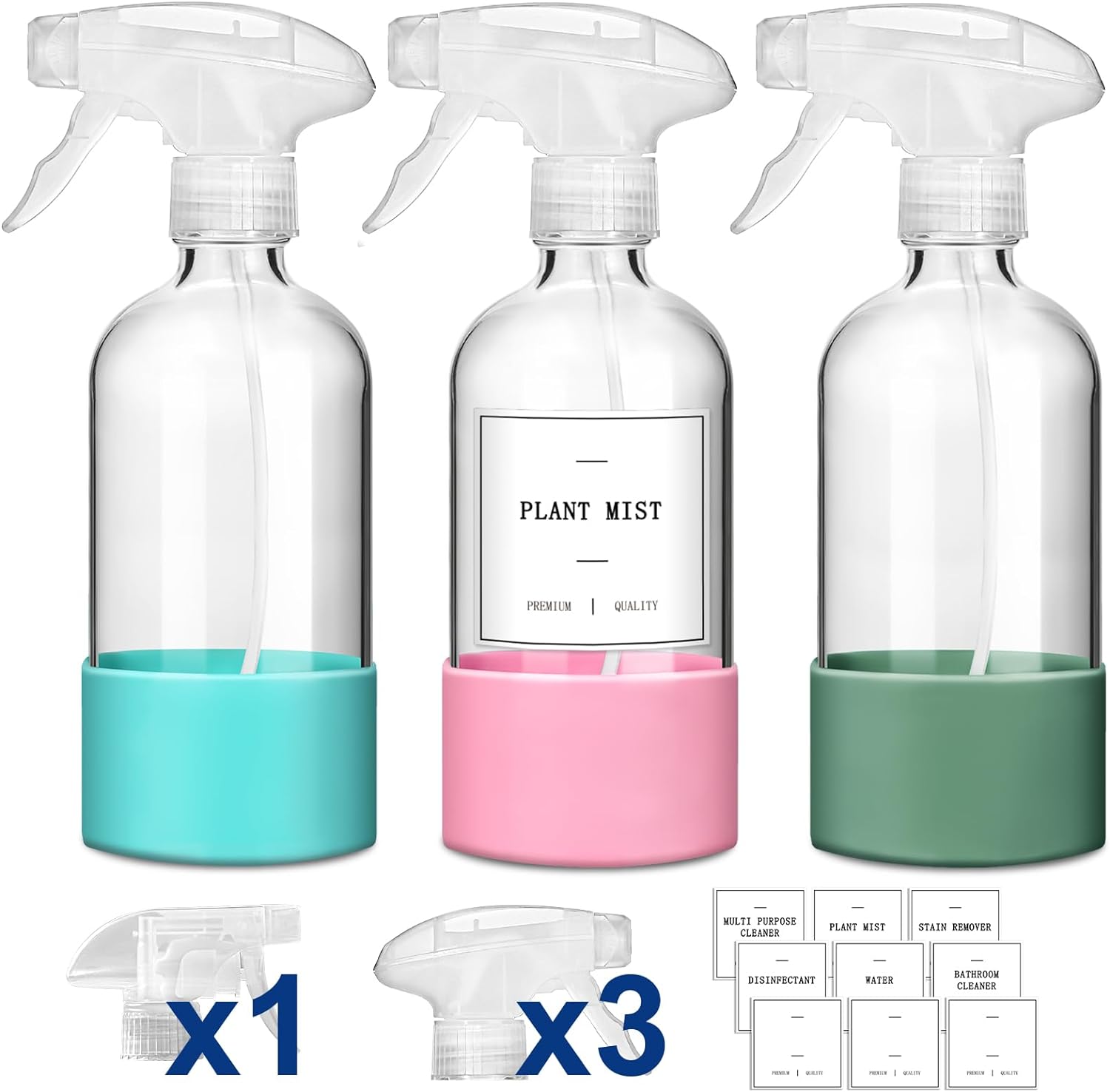 GMISUN Glass Spray Bottles for Cleaning Solutions, 16oz Reusable Spray Bottles for Cleaning, 3Pack Clear Empty Cleaning Bottles with Silicone Sleeve and Labels for Plants - 3pcs Upgraded Nozzles