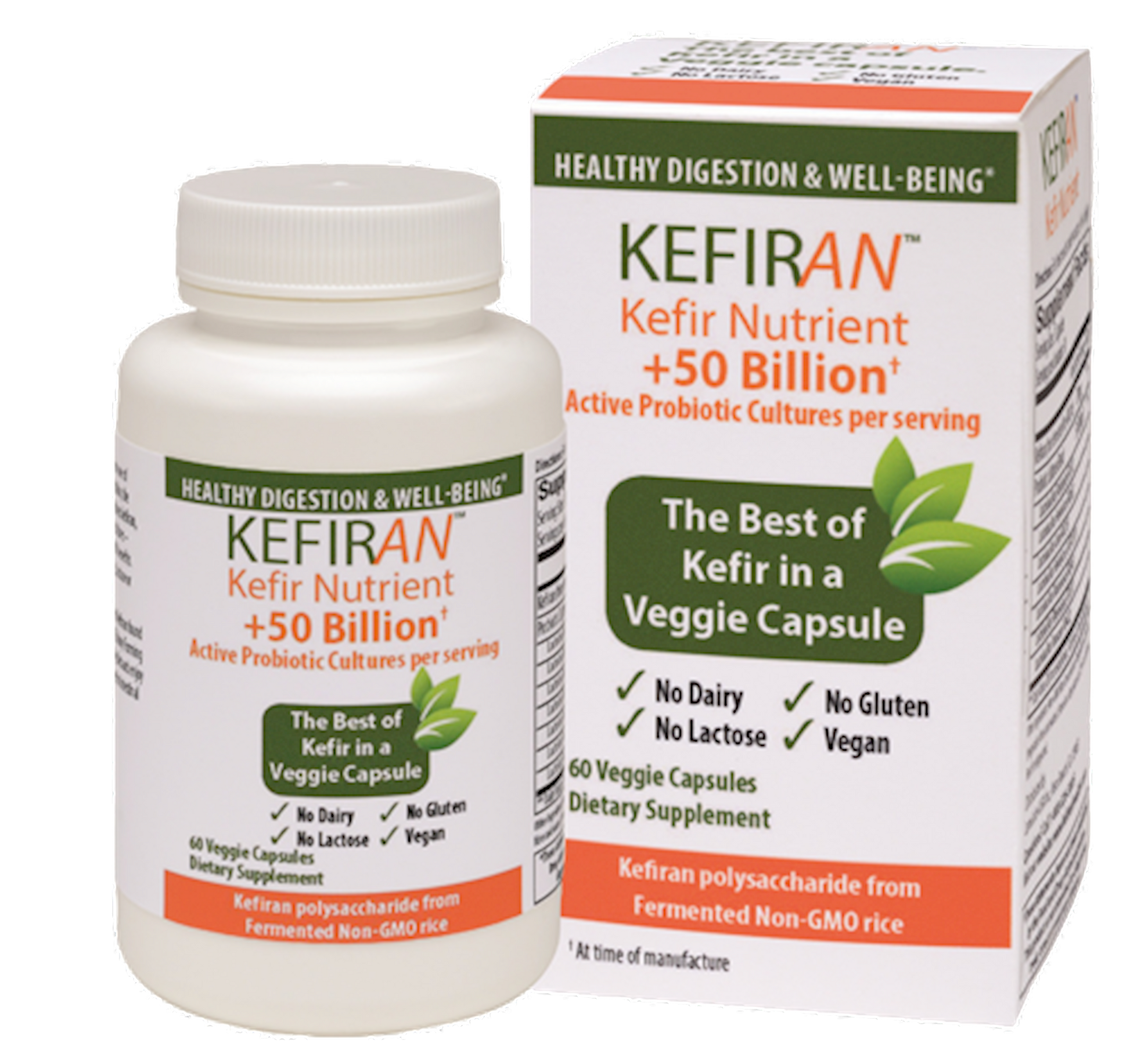 Dietary Supplement Kefir is a fermented milk beverage oringating from one of the wowrld's top longevity regions. During fermaentation, the L. Kefiranofaciens bacteria in traditional kefir produces kefiran, a polysaccharide that-along with the probiotic cultures-is believed to be the primnary source of kefir's health benefits. Unlike traditional kefir, Kefiran contains no dairy, lactose or gluten. Kefiran is vegan and low calorie. Two Kefiran capsules provide the same amount of kefiran found in 1 quart of traditional kefir PLUS 50 billion CFU(Colony Forming Units) of active clutures. Add Kefiran to your daily diet and enjoy the benefits of the traditional fermented beverage for intestinal health and well-being*