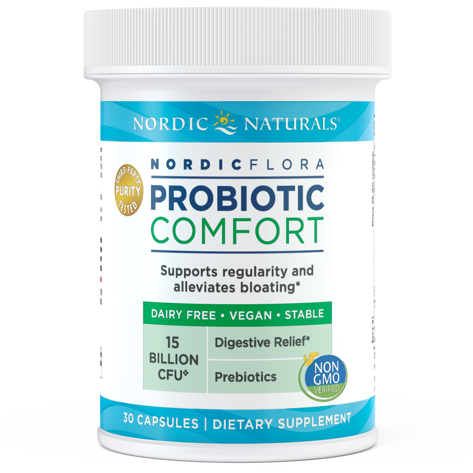 Nordic Flora™ Probiotic Comfort is a blend of thirteen probiotic strains with 15 billion cultures and prebiotics, to promote gut biodiversity and optimal digestion.* This formula also helps alleviate occasional gas, bloating, and constipation.*