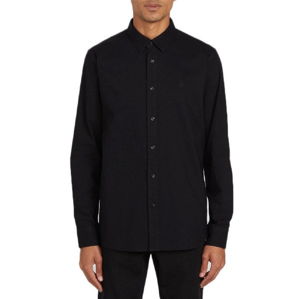 VOLCOM MENS OXFORD STRETCH LONG SLEEVE BUTTON-UP The straight-ahead style of the Oxford Stretch shirt takes your look up a notch without you losing your edge. Premium cotton-blend fabric is enhanced with stretch to make this men's black long sleeve shirt your go-to for all your active pursuits. Modern fit Model Is Wearing Size Medium 53 Cotton 44 Polyester 3 Elastane Woven Label Branded Logo Buttons