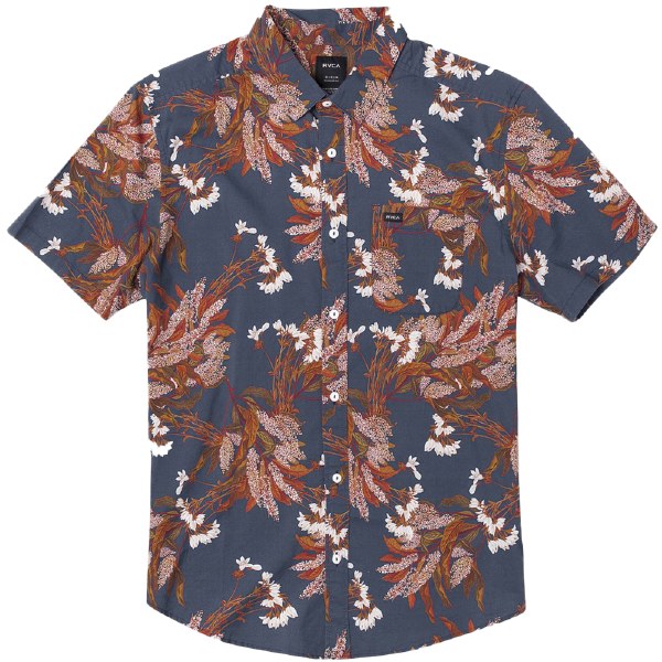 REGULAR FIT. CUSTOM ALL OVER PRINT. PATCH POCKET AT LEFT CHEST. RVCA SOLO LABEL AT POCKET HEM. MENS' FLORAL SHIRT ALLOVER TROPICAL PRINT PATCH POCKET AT LEFT CHEST WITH WOVEN LABEL BUTTON DOWN FRONT SHORT SLEEVES REGULAR FIT WOVEN MATERIALS 55.0 COTTON, 45.0 VISCOSE