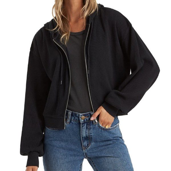 Style: J6023BPE Proof that dreams do come true: the mix of a thermal and hoodie is here. A weekend s new favorite, the Perfect Sunday hoodie is made from waffle thermal fabric, relaxed with wide sleeves and a slouchy cut. Features: Womens' hooded top. Zip-up hoodie style. Rib bands. Material: Waffle knit. Materials 80 Cotton, 20 Polyester