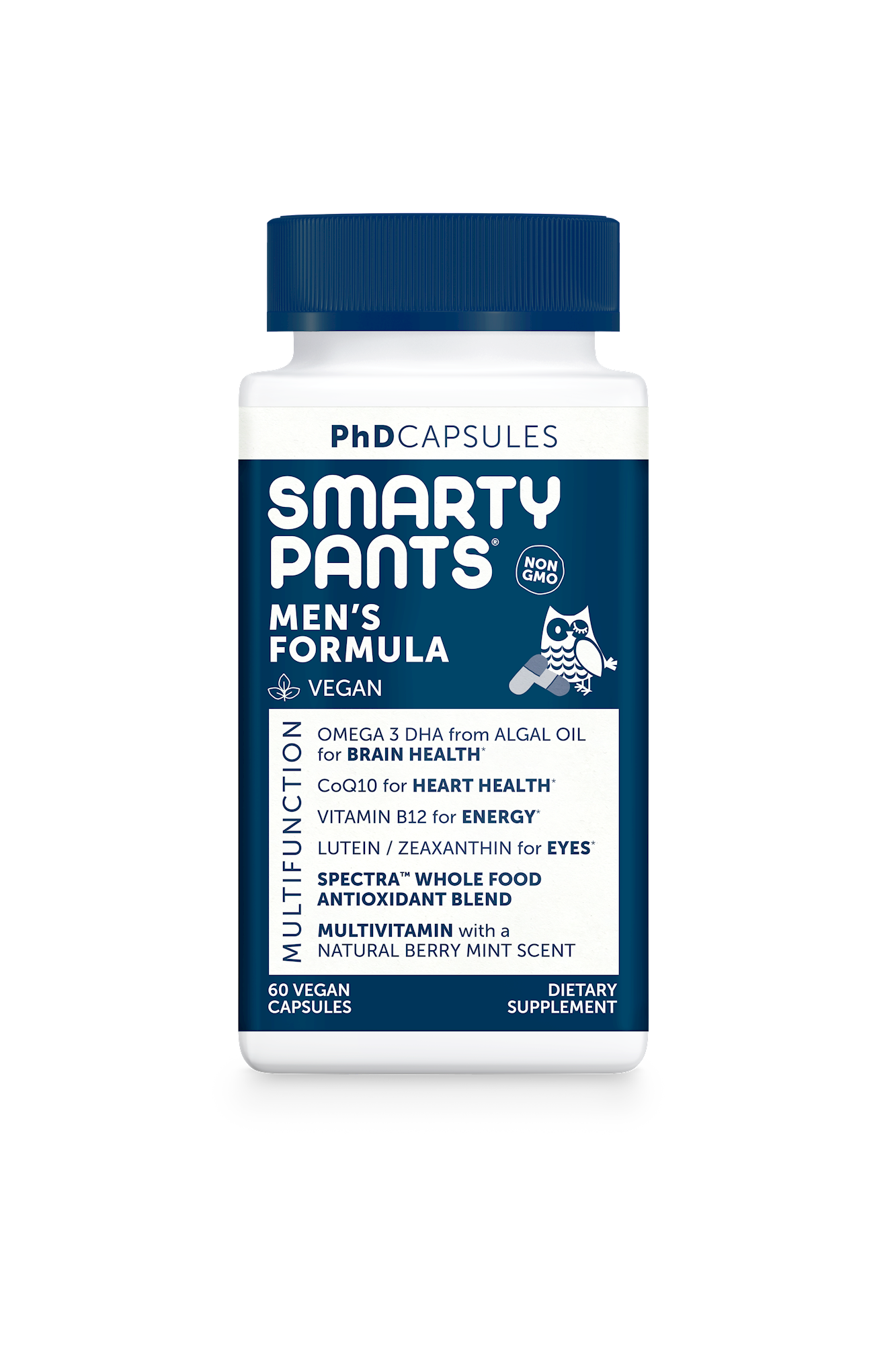 Serving Size: 2 Capsule Servings Per Container: 30 Disclaimer Amount Per Serving Vitamin A (as 50% beta-carotene USP, retinyl palmitate USP) 270 mcg 30% Vitamin A (as 50% beta-carotene USP, retinyl palmitate USP) Vitamin C (as ascorbic acid) 54 mg 60% Vitamin D (D-3 as cholecalciferol from Lichen) (1600 IU) 40 mcg 200% Vitamin E (as d-alpha-tocopherol from sunflower oil) 9 mg 60% Vitamin K (K-1 as phylloquinone) 36 mcg 30% Thiamin (Vitamin B-1 as thiamine mononitrate) 0.6 mg 50% Riboflavin (Vitamin B-2) 0.26 mg 20% Niacin (Vitamin B-3 as inositol niacinate) 4 mg 25% Vitamin B-6 (as pyridoxal 5-phosphate) 1.7 mg 100% Folate (as L-methylfolate, glucosamine salt) DFE 400 mcg 100% Vitamin B-12 (as methylcobalamin) 4.8 mcg 200% Biotin 15 mcg 50% Pantothenic acid (as calcium D-pantothenate) 1.5 mg 30% Choline (as choline bitartrate USP) 55 mg 10% Iodine (as potassium iodide USP) 150 mcg 100% Magnesium (as magnesium citrate USP) 8.4 mg 2% Zinc (as zinc citrate) 11 mg 100% Selenium (as L-selenomethionine) 14 mcg 25% Copper (as copper chelate) 0.72 mg 80% Algal oil 75 mg Omega-3 DHA (docosahexaenoic acid) 50 mg Vitamin K-2 (as menaquione-7) 18 mcg Coenzyme Q10 (as ubiquinone USP) 60 mg Inositol (as inositol niacinate) 1 mg Lutemax 2020 marigold flower extract 40 mg Lutein 10 mg Zeaxanthin 2 mg Smartypants probiotic blend: 3 billion CFU 30 mg Bacillus coagulans MTCC5856 lactospore 2 bilion CFU 20 mg Bacillus subtilis DE111 1 billion CFU 10 mg Spectra whole food antioxidant blend: 100 mg Coffea arabica Extract Green Tea Extract Broccoli Sprout Onion Extract Apple Extract Quercetin Maltodextrin Acerola Extract Tomato Broccoli Acai Basil Cinnamon Garlic Oregano Turmeric Carrot Elderberry Mangosteen Camu Camu Blackberry Blackcurrant Extract Blueberry Extract Raspberry Spinach Chokeberry Kale Sweet Cherry Bilberry Extract Silicon Dioxide Sunflower Lecithin Brussels Sprout Other ingredients: Modified food starch, Hydroxypropylmethylcellulose (Vegan Capsule), Rice Flour, Rice starch, Pectin, Natural flavor, Glycerol, Coconut Oil Powder, Mixed tocopherols, Silicon dioxide