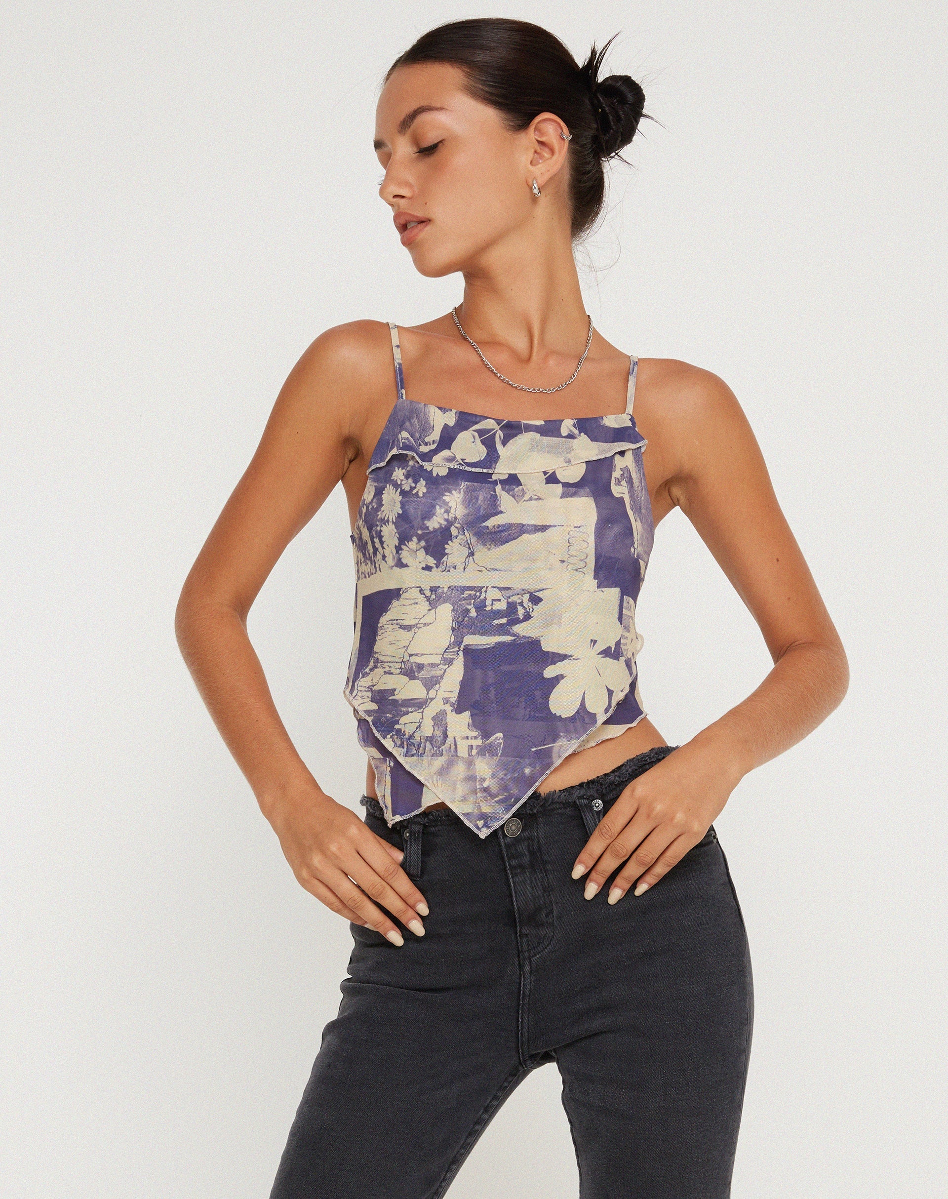 Strappy mesh vest top featuring a frill neck detail and handkerchief hem in a printed collage floral shadow purple. We love to pair with our Frayed jeans.